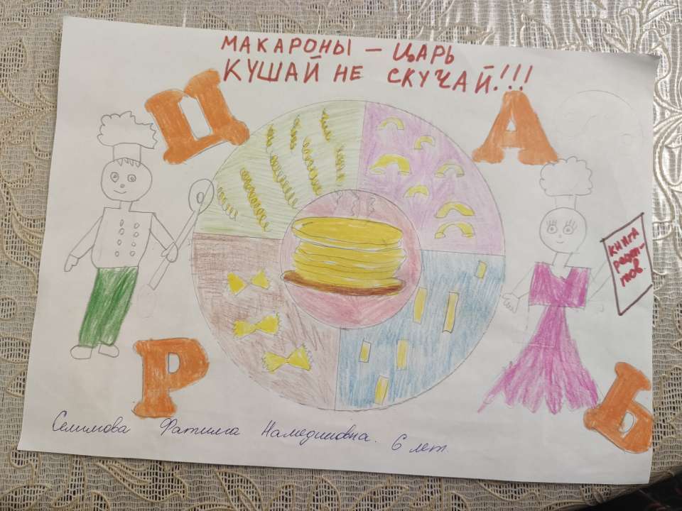 Мы нарисовали тарелку с разными макаронами которые я люблю и в середине самое любимое, это блины. По краям два поваренка , которые спешат приготовить вкусно эти макароны.